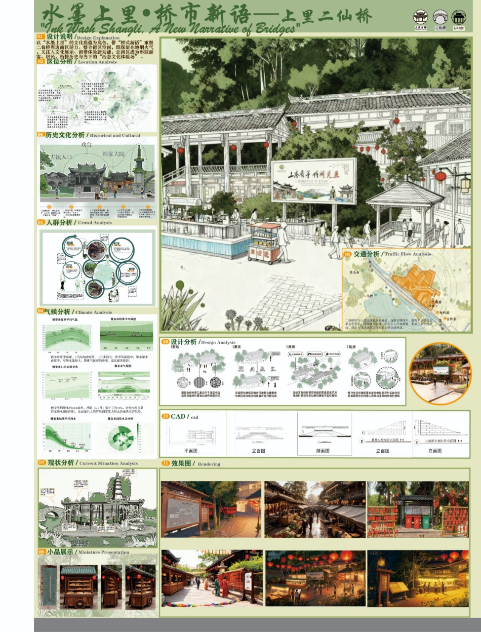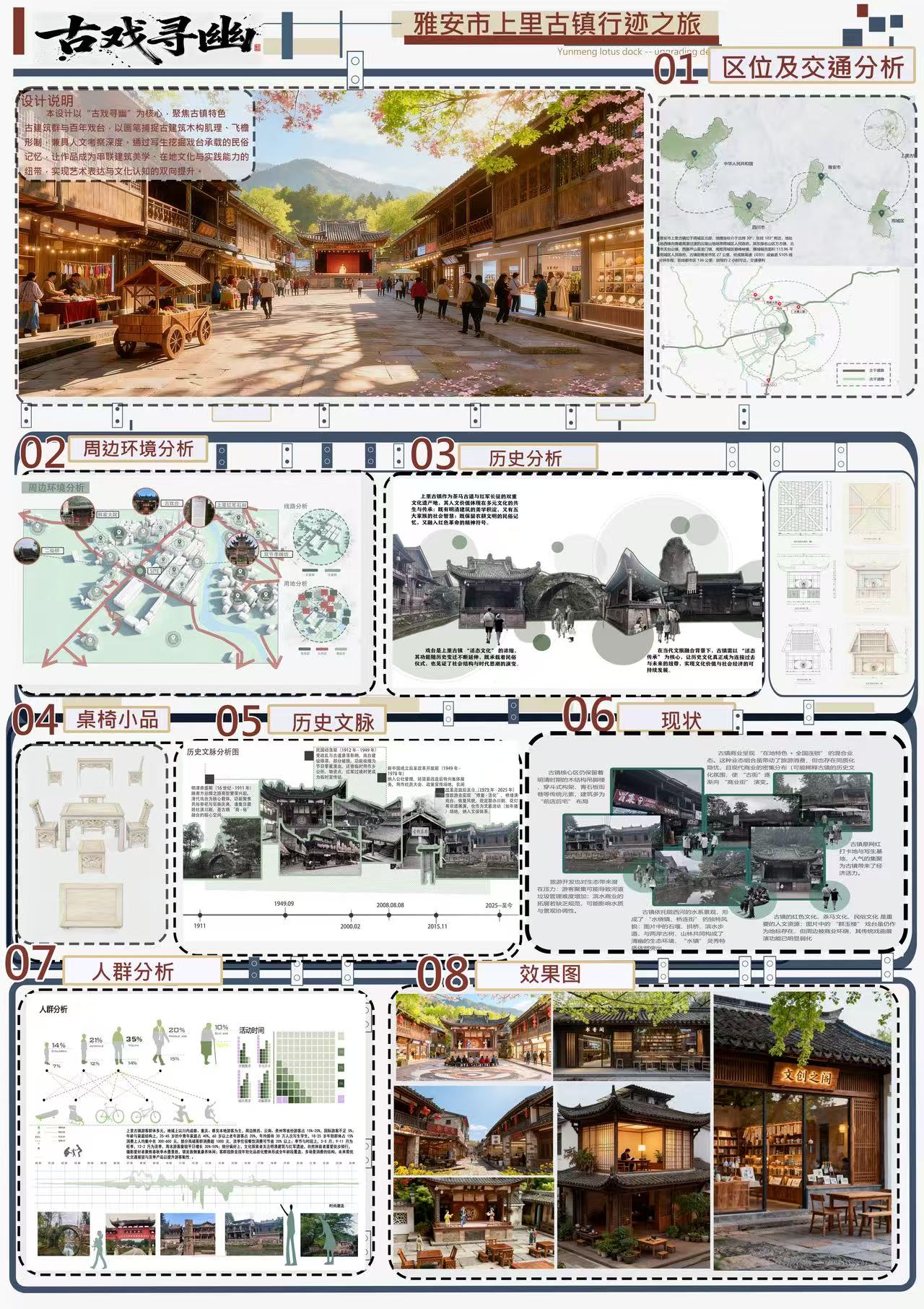 为深化实践教学改革,探索育人新路径,10月27日至11月7日,ballBET贝博BB艾弗森艺术与传媒学院组织环境设计、视觉传达设计两个专业共595名学子,共赴四川雅安上里古镇,开展以“田野双生”为主题的人文考察与写生实践教学。 此次活动旨在引导学生在真实的文化场域中,完成从感知、记录到转译、创造的全流程设计思维训练,突破传统写生模式,强调“考察”与“转译”并重,两个专业基于同一文化土壤,绽放出专业特色的设计之美,形成了鲜明的教学特色与创新成果。 一、双专业特色并进,重构实践教学路径 环境设计于空间中解读人文,在场地内重构价值,侧重于“空间感知与场地重构”。在团队教师的带领下,194名学子通过实地测绘、空间记录与改造设计,深入剖析韩家大院、古戏台、街巷肌理等古镇空间,用卷尺测绘空间尺寸,用图纸解析格局,完成从“观测-解析-重构”的完整设计思维训练,最终成果以A0综合设计展板、室内外改造方案等形式,实现传统空间向当代设计的文化转译。 视觉传达于细节中解码文化,在图形中转译精神,聚焦于“视觉解构与符号转译”。教学团队创新性地设置了八个极具深度的研究性命题,如《桥与水的共生图形》、《味觉的图形转译》等,要求学生从中任选至少四个方向进行探索。教学重点在于引导学生超越表象记录,运用视觉笔记、图形解构、创意重组等专业方法,将古镇的石桥、茶文化、哒哒面、木雕纹样、红军石刻等文化元素,转化为一套套具有现代设计感的抽象图形、色彩体系与视觉符号,并以系列海报或设计素描作为最终作业。 二、构建“田野—课堂—社会”育人闭环 本次实践改革的核心在于打破了传统写生仅停留在风景描绘的局限,构建了“田野调研—设计整合—成果展示”的完整教学闭环。 在古镇的十二天里,学生们遵循“半天采集素材+写生,半天讨论+辅导+设计”的节奏,将现场感受迅速转化为设计思考。环境设计学生的手绘、测绘与视觉传达学生的图形提取、符号设计在古镇场域中创意思维。 三、以实践贯通美育,于传统启迪创新 此次“田野双生”实践,成功构建了“田野调查-课堂研讨-社会展示”的完整教学闭环,是艺术与传媒学院深化“以美育人、以文化人”培养路径的生动缩影。在古镇,环境设计学生把对空间的宏观把控作为场景语境,而视觉传达学生对细节的敏锐捕捉则注入视觉温度。 通过这次活动,艺术与传媒学院有效打通了“课堂-自然-社会”的育人通道,引导学生在未来的艺术设计道路上,真正学会追寻美、创造美、传播美,为培养具备深厚人文素养与强劲创新能力的复合型艺术设计人才写下了浓墨重彩的一笔。 (文:陈洁/图:朱耀璞、罗希、高翔、李欣灿、罗益 传媒中心 胡紫怡/编辑)