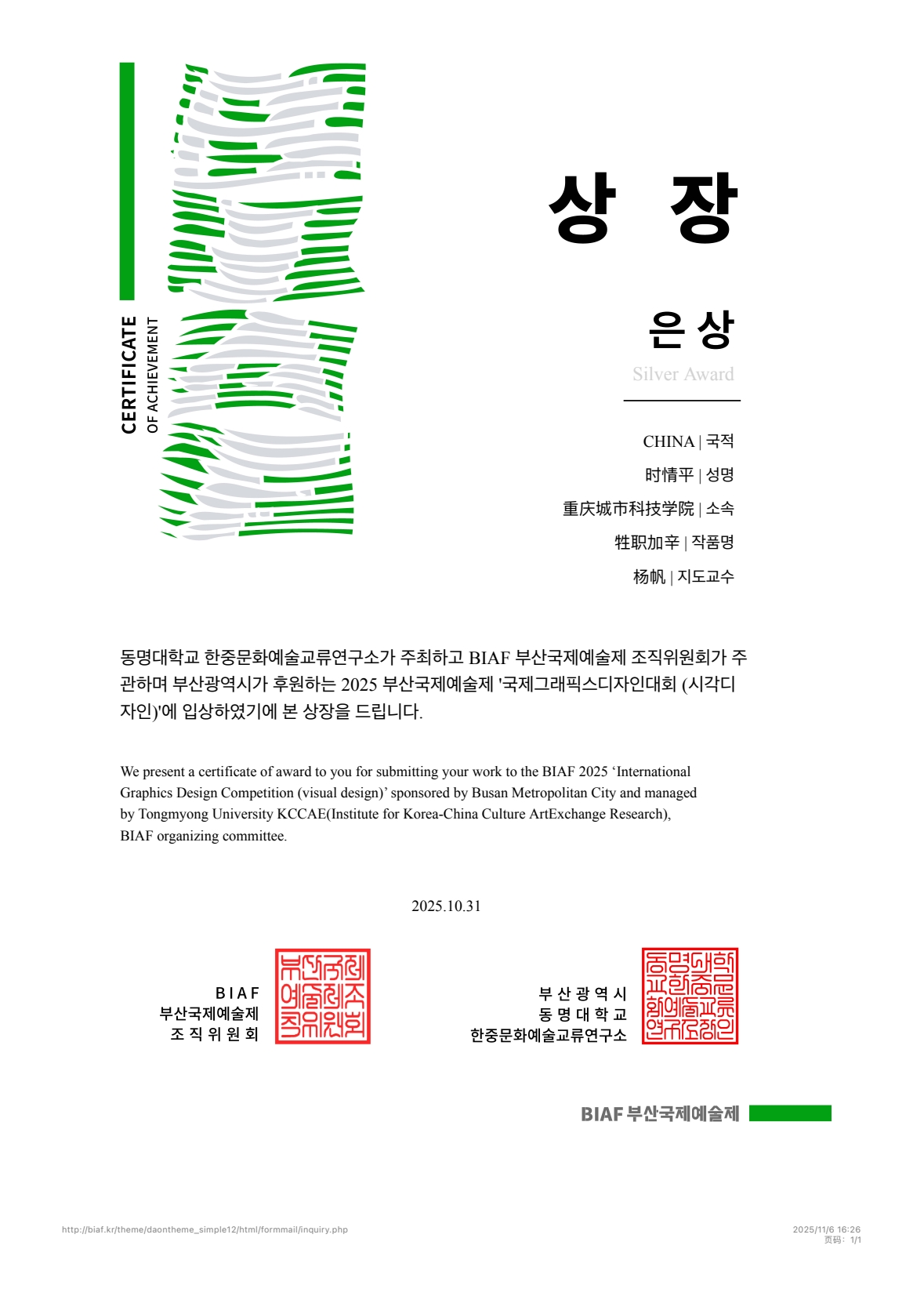 近日,BIAF2025釜山国际艺术节全球总决赛评审结果揭晓。BIAF2025全球总决赛有来自85个国家和地区的3651件优秀作品参评,学校艺术与传媒学院视觉传达设计专业时情平同学的参赛作品《牲职加辛》,历经重重选拔,荣获BIAF2025全球总决赛银奖。 BIAF2025釜山国际艺术节是由韩国釜山市政府批复,中韩文化艺术交流研究院主办,立足于韩国,面向全球各国院校及艺术机构开展的艺术、设计及数字媒体等作品竞赛、作品展示、学术交流的国际展赛。旨在激发艺术教育领域人才培养热情,提高专业人才培养质量,提升从业设计师的创意能力和设计水平。本赛事是艺术创意领域极具影响力的国际化展赛之一,在推进文化艺术进步、国际交流合作等方面,为地球村文化艺术的升华,为国际文化艺术交流作出了突出贡献。 BIAF2025 以“Industry 4.0 + Art”为主题,打造全球最前沿的科技艺术实验场!本届艺术节已于2025年10月26日至11月2日在釜山广域市举行。学校学子时情平凭借《牲职加辛》作品在众多参赛作品中脱颖而出,充分彰显了作品的独特创意价值。《牲职加辛》作品聚焦当代青年“职场生态”这一社会议题,以“动物拟人化”为创意切入点,将“牛马”“吗喽”“狗”等网络热梗中的动物形象转化为职场人群的生动隐喻。作品趣味化的设计解构了职场生态,以夸张又写实的卡通风格精准捕捉了当代年轻人的职场情绪。 此次比赛获奖,学院提供政策与资源支持,教师进行专业指导与课程融合创新,学生积极参与实践训练,积极构建“以赛促学、学赛结合”的良好生态,共同推动竞赛育人机制落地见效。未来,学校将继续深化“创意赋能、国际视野”的育人路径,鼓励更多师生关注社会议题、深耕艺术创新,通过赛事平台、国际交流等渠道,让更多优秀设计作品走出校园、走向国际,以青年创意讲好中国故事,为文化艺术领域的创新发展贡献 “城科力量”。(杨帆、时情平/文 时情平/图 传媒中心马子微/编辑)