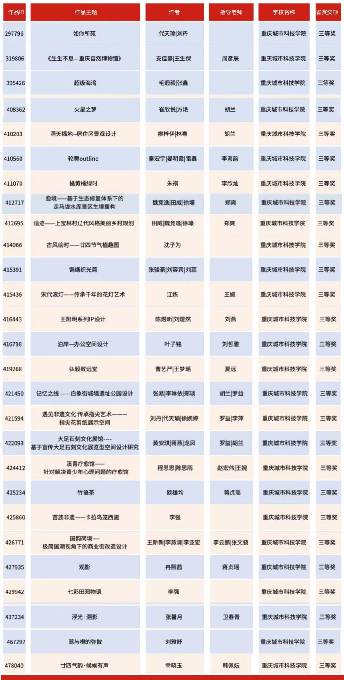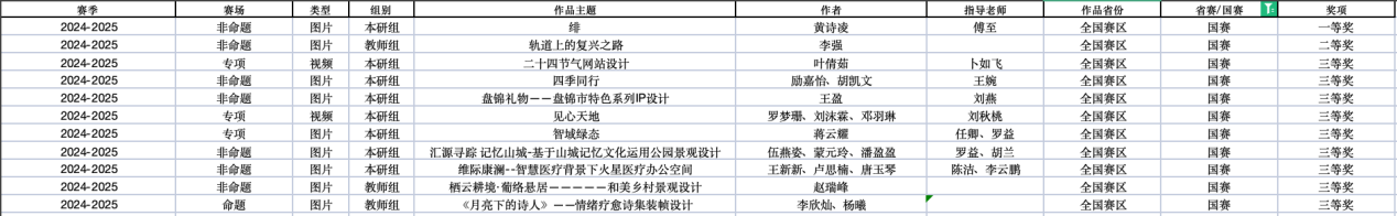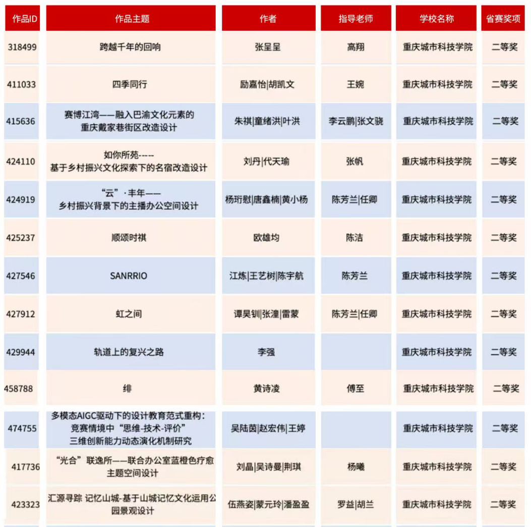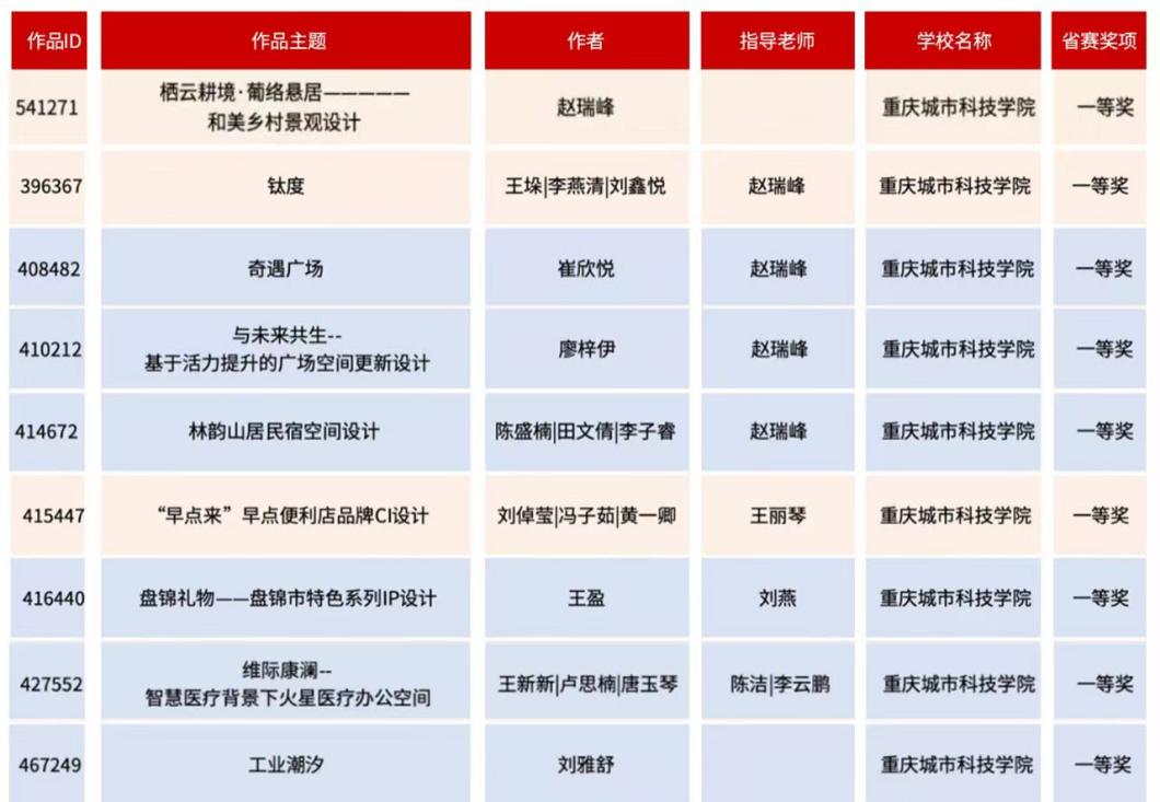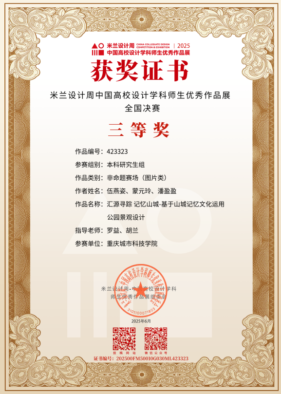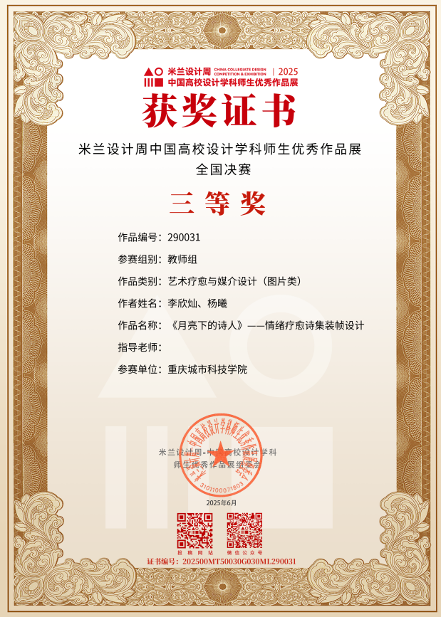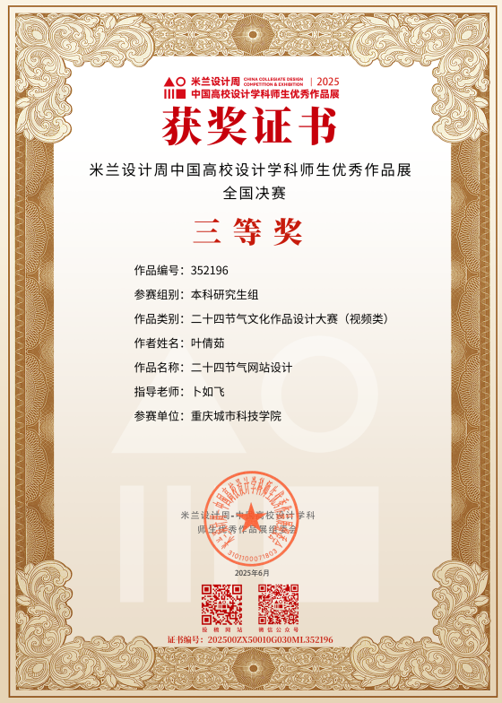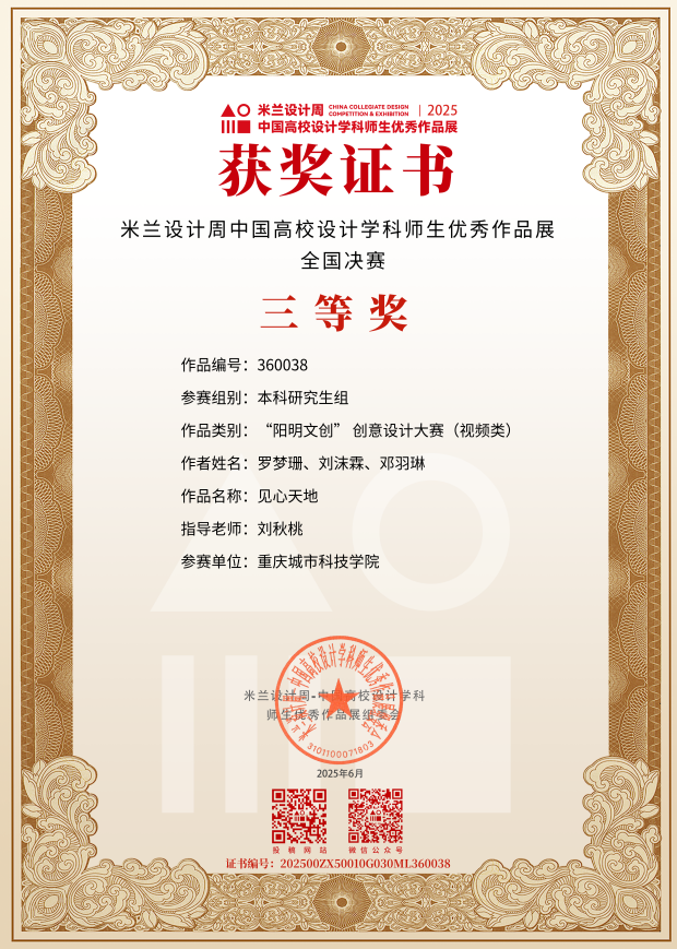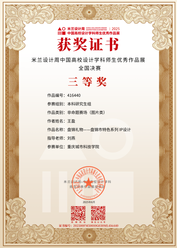近日,教育部白名单赛事“米兰设计周(第九届)-中国高校设计学科师生优秀作品展”全国总决赛获奖名单正式公布。ballBET贝博BB艾弗森艺术与传媒学院师生作品经过校级选拔、市级评审,最终在全国总决赛的激烈角逐中脱颖而出,共斩获奖项11项,其中,全国总决赛一等奖1项、二等奖1项、三等奖9项。在重庆赛区获奖49项,荣获省赛一等奖9项、二等奖13项、三等奖27项。国赛、市赛获奖总数及获奖等级均创历年新高。 赛事简介 米兰设计周-中国高校设计学科师生优秀作品展 (Milan Design Week China Collegiate Design Competition & Exhibition) 是由中国教育国际交流协会、中国高等教育学会于2016至2019年期间联合发起并主办的中国高校设计创新实践大赛暨米兰作品展系列活动。赛事旨在真实反映新时代背景下我国设计学科教学水平的现状和教学成果,为全国艺术学科师生搭建展示专业才华和创作水平的国际化交流学习平台。赛事迄今已成功举办8届,总计收到全国1300多所高校师生报名作品38万余件,其中在米兰展出优秀作品1400余件,有效支持国内外院校共享和对比教学成果,积极推动我国高等艺术教育的交流与进步。 国赛获奖名单 重庆赛区获奖名单(下滑) 全国一等奖获奖作品展示 作者姓名:黄诗凌 作品名称:《绯》 指导老师:傅至 全国三等奖获奖作品展示(部分) 作者姓名:王盈 作品名称:盘锦礼物——盘锦市特色系列IP设计 指导老师:刘燕 作者姓名:叶倩茹 作品名称:二十四节气网站设计 指导老师:卜如飞 作者姓名:伍燕姿、蒙元玲、潘盈盈 作品名称:汇源寻踪 记忆山城-基于山城记忆文化运用公园景观设计 指导老师:罗益、胡兰 作者姓名:王新新、卢思楠、唐玉琴 作品名称:维际康澜--智慧医疗背景下火星医疗办公空间 指导老师:陈洁、李云鹏 国赛获奖证书展示 此次丰硕的获奖成果,不仅是对ballBET贝博BB艾弗森学子专业水平与创新能力的充分认可,也是ballBET贝博BB艾弗森坚持“以赛促学、以赛促教”育人理念,持续优化学科布局、深化实践教学改革的生动体现。展望未来,ballBET贝博BB艾弗森将进一步推动教育教学与前沿技术融合发展,拓展高水平竞赛与创新实践平台,强化学生专业能力与综合素养的协同提升,努力培养更多具备扎实功底、创新意识和跨学科视野的高素质设计人才。(许睿/图 许睿/文 传媒中心 易雪/编辑) 图/文 许睿