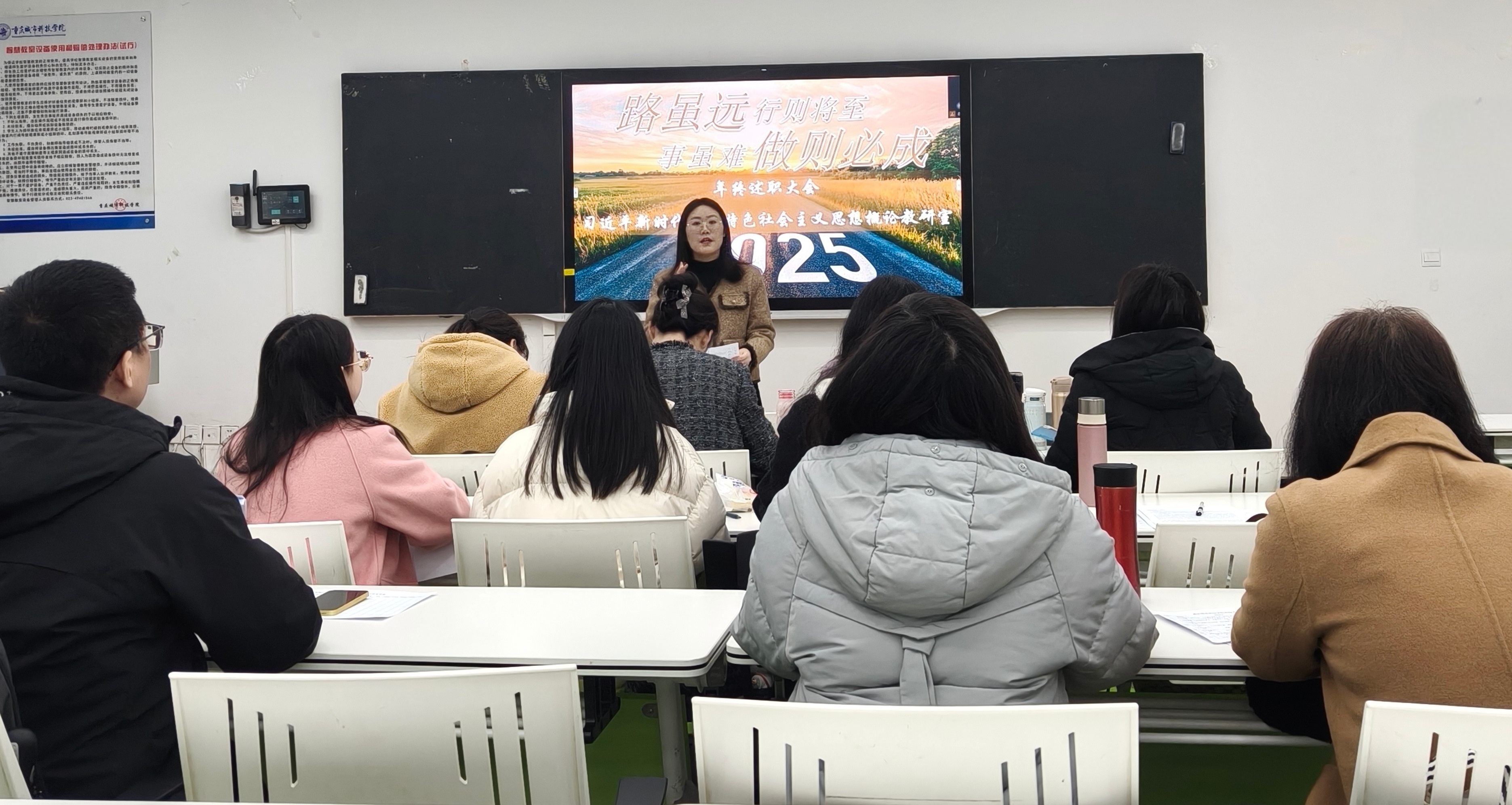 知往鉴来,行稳致远。2015年12月17日,马克思主义学院习近平新时代中国特色社会主义思想概论教研室在主教215教室开展2025年度述职会议。本次会议由教研室副主任成丽主持,教研室主任及全体教师参与本次会议。会议旨在总结2025年、展望2026年,凝聚团队力量,共同提升思政育人实效。 教研室全体教师秉持实事求是、突出重点、紧抓亮点汇报原则,围绕本年度教学工作、科研成长、论文发表、教学竞赛、学院建设参与情况、个人成长与不足、下一年工作与成长规划等方面进行了总结汇报。 在教学方面,多位教师承担《习近平新时代中国特色社会主义思想概论》《毛泽东思想和中国特色社会主义理论体系》《思想道德与法治》《中国近现代史纲要》等核心课程,注重课堂创新,通过案例教学、实践作业、考研衔接等方式提升教学吸引力,全年教学运行平稳有序。科研方面,部分教师积极参与课题申报、论文撰写与教学案例开发,部分教师获市级、校级奖项。在招生、党建、督导、学生竞赛指导等事务中,教师们全面投入,展现出高度的敬业和责任。多位教师在述职中反思自身不足,普遍提到科研深度、教学创新及参赛韧性等方面仍需提升,表达了下一年度深耕教学、加强科研的决心和力度。 会议最后,教研室主任陈胜婷以“深、全、竞”三字对全年工作作了整体总结:一是教师深耕教学、融合科研,课堂扎实、效果显著;二是全面参与学校各项事务,展现多重角色担当;三是在各类竞赛中积极进取、屡获佳绩。她充分肯定了教研室团队的凝聚力与教师们的辛勤付出,同时强调期末阶段更应严守教学纪律,“站好最后一班岗”,以持续力推动教研室工作迈向平稳提质新阶段。 此次述职会议在务实、团结的氛围中圆满结束,不仅是对过去一年工作的系统回顾与反思,更是为新一年的工作指明了方向、凝聚了共识。全体教师将以此次会议为新的起点,继续保持育人初心,增强团队协作,在教学、科研与育人实践中不断开拓进取,共同谱写思政育人新篇章。 ( 罗萍/文/图 传媒中心马子微/编辑)