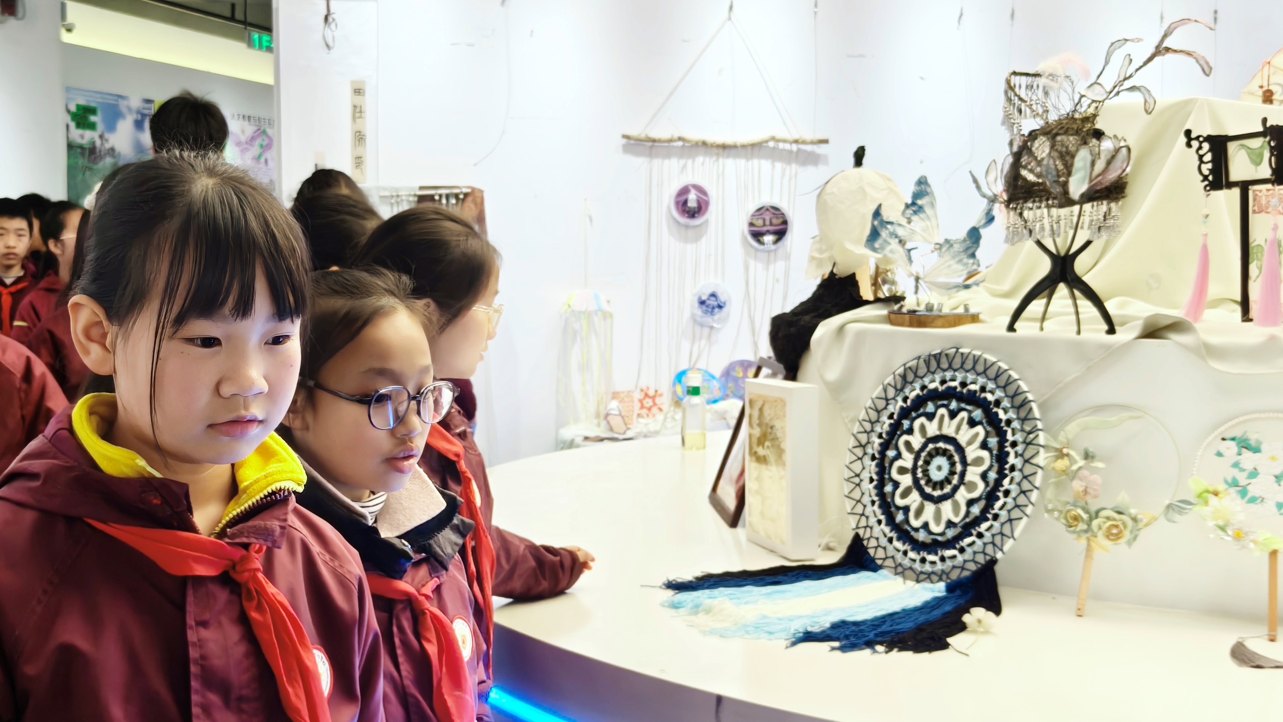 步入求是楼艺术展厅,同学们沉醉于画作与装置艺术构成的视觉盛宴。志愿者以童趣化语言解析创作逻辑与技法,引导他们观察色彩形态、解读符号情感。这场欣赏既以美育浸润心灵,更通过观察分析训练思维,拓宽智识边界。
