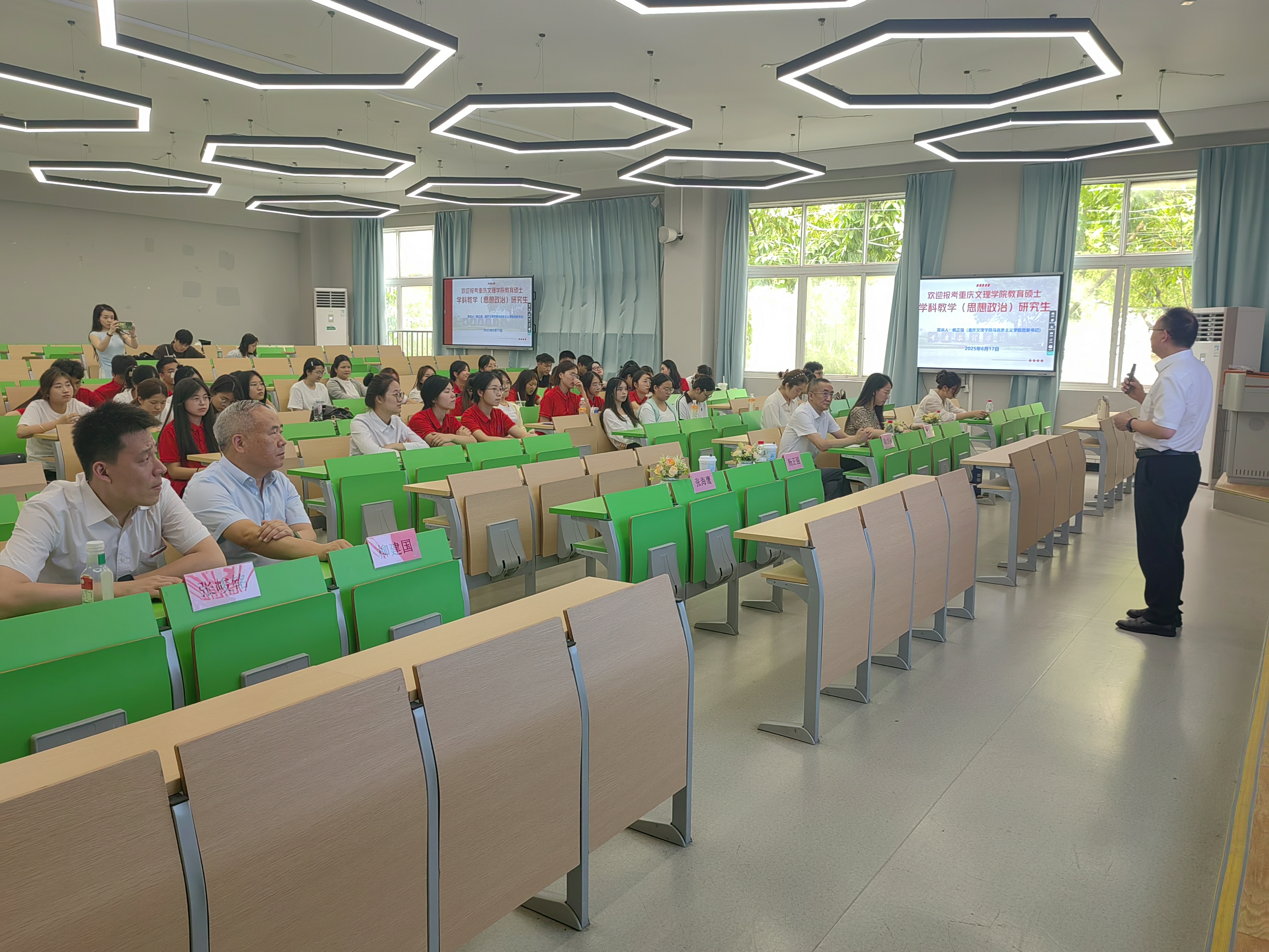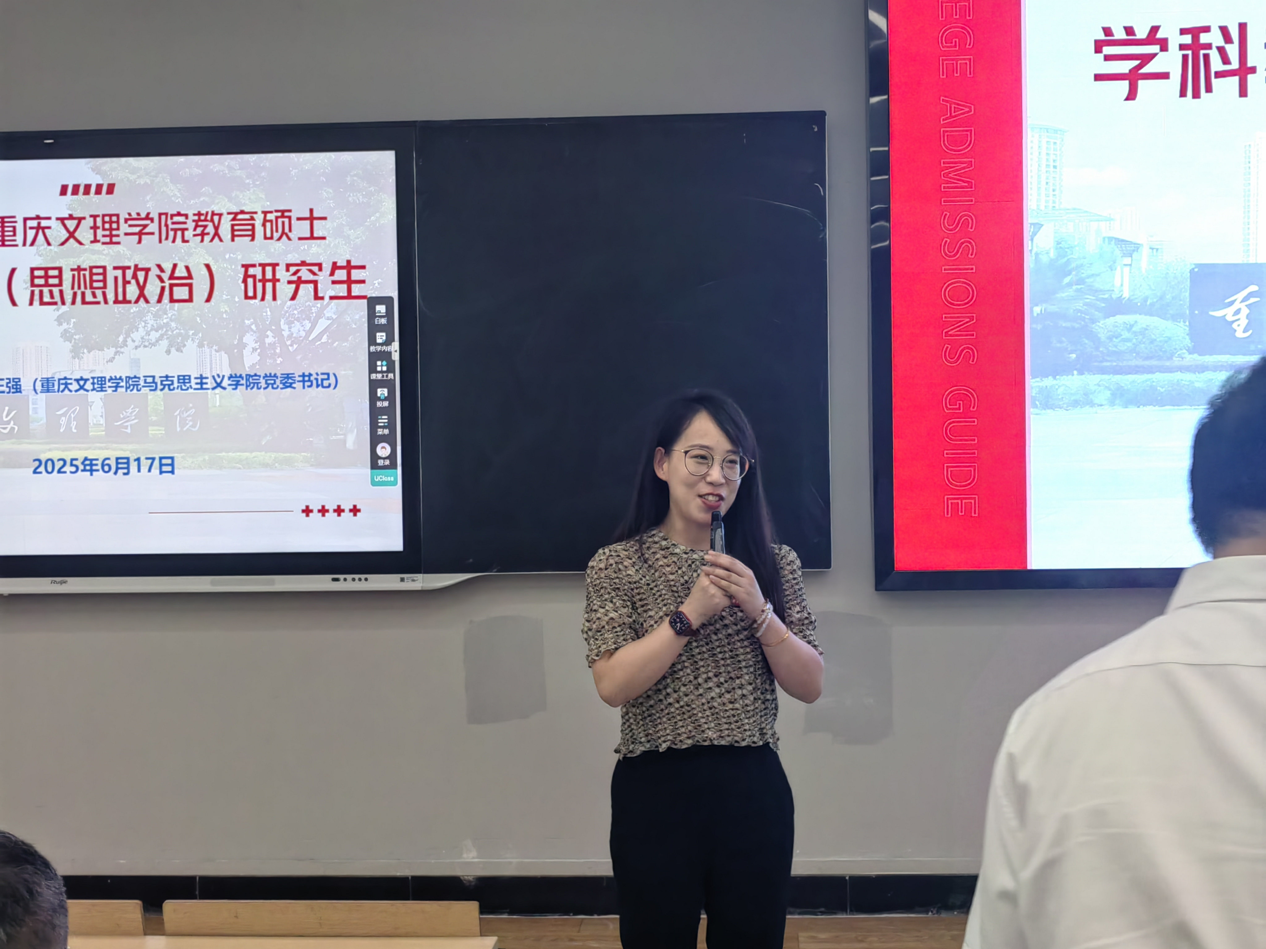 为深化校际合作,助力学子规划深造路径,2025 年 6 月 17 日,马克思主义学院在主教 311 会议室举办思想政治教育专业考研宣讲会。重庆文理学院马克思主义学院党委书记杨正强受邀担任主讲嘉宾,马克思主义学院院长段吉福、副院长张沙沙、思政系主任柳建国、副主任张峻铭,及重庆文理学院马克思主义学院学工办主任、团委书记张海鹰出席会议。23 级思政 1-3 班与 24 级思政专升本 1 班学生现场聆听。 杨正强书记在宣讲中全面介绍重庆文理学院及马克思主义学院整体情况,重点围绕马克思主义学院学科教学(思想政治)专业硕士方向的设置背景、专业特色、师资配置及就业前景展开详解,并从考研报考流程、备考注意事项等维度为学生提供清晰指导。 针对学生关切的考研热点问题,杨正强书记逐一耐心解答。张沙沙副院长在总结中表示,本次宣讲会为学生搭建了了解考研信息、规划深造路线的优质平台。学院将持续深化校际合作,整合优质教育资源,助力更多学生实现深造梦想,推动高质量就业。 此次宣讲会通过校际联动与专业解读,为学生提供了兼具针对性与实用性的考研指引,进一步拓宽了人才培养与发展的合作渠道。(马克思主义学院/图 马克思主义学院/文 陈梦玲/编辑)