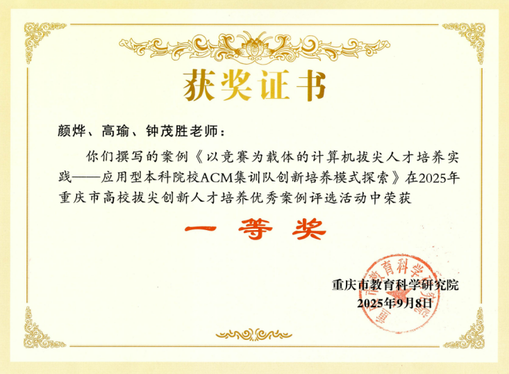 重庆市教育科学研究院发布了《重庆市教育科学研究院关于重庆市高校拔尖创新人才培养优秀案例获奖情况的通报》,ballBET贝博BB艾弗森人工智能与大数据学院推选案例《以竞赛为载体的计算机拔尖人才培养实践——应用型本科院校ACM集训队创新培养模式探索》荣获一等奖。