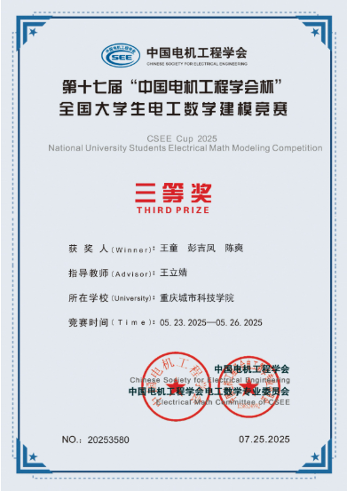 重庆城科学子在第十七届“电工杯”全国大学生电工数学建模竞赛中 斩获佳绩 近日,第十七届“电工杯”全国大学生电工数学建模竞赛获奖名单正式公布。我校学子在本次竞赛中表现优异,共荣获全国二等奖3项、三等奖6项,充分展现了我校学生在数学建模方面的扎实功底与创新能力,也反映出学校在学科竞赛方面的培养成效。 本届竞赛由中国电机工程学会电工数学专业委员会主办,是国内电气工程与数学交叉领域的一项重要赛事,吸引了来自清华大学、浙江大学、复旦大学、武汉大学、同济大学、国防科技大学、中国科学技术大学等全国31个省(区、市)968所高校的万余支队伍同台竞技。竞赛始终秉持“以赛促研、以赛促学”的理念,鼓励学生以团队协作方式,综合运用电工技术、人工智能、大数据等多学科知识,解决电力系统中的实际问题,致力于为能源电力行业输送具有创新能力和实践能力的复合型人才。 我校参赛队伍在比赛中展现出优秀的跨学科协作与解决复杂工程问题的能力,这得益于学校近年来在跨学科教育体系构建与创新能力培养方面的持续投入。通过组建多学科背景的指导教师团队,学校积极激发学生的创新潜能,提升其竞赛实战水平,全面助力学生成长成才。此次优异表现,充分印证了我校在高素质应用型人才培养方面的实践成果。展望未来,我校将进一步深化“以赛促教、以赛促学”的育人机制,不断加强专业能力建设,稳步提升人才培养质量。(刘玉锋、代鸿/文 传媒中心 熊素平/编辑)