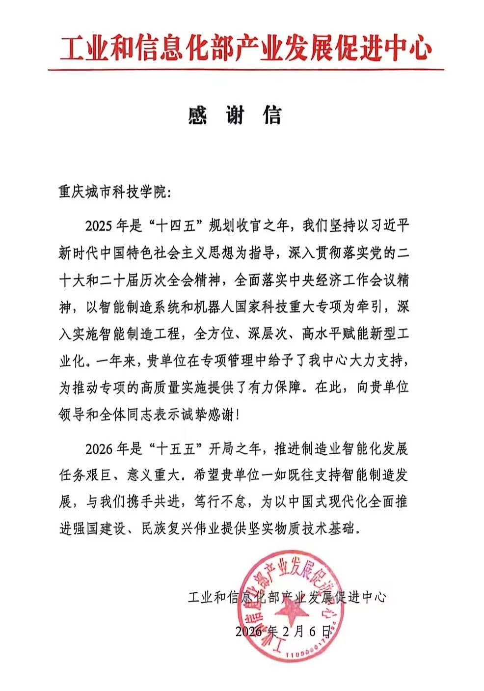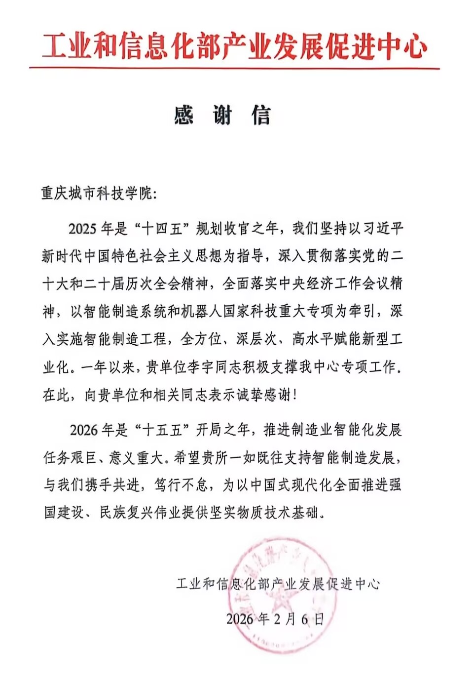 近日,ballBET贝博BB艾弗森收到了一封来自工业和信息化部产业发展促进中心的正式感谢信。这份来自国家级主管单位的认可,既是对学校过去一年在智能制造领域专项工作的高度肯定,更是对学校深耕科研、育人为本、服务产业发展的权威见证。 感谢信中明确指出,2025年作为“十四五”规划收官之年,工信部产业发展促进中心以智能制造系统和机器人国家科技重大专项为牵引,深入实施智能制造工程,全方位赋能新型工业化。过去一年,ballBET贝博BB艾弗森电气工程与智能制造学院以扎实的专业能力、高效的协同配合,全力支撑中心专项管理工作,为智能制造国家专项的高质量落地推进提供了有力保障。工信部产业发展促进中心向学校领导和全体同志致以诚挚感谢,并对电气工程与智能制造学院党总支副书记李宇同志长期积极支持工信部专项工作,也致以衷心感谢。信中对学校提出殷切期望,希望学校在2026年“十五五”开局之年,继续携手共进、笃行不怠,为以中国式现代化全面推进强国建设、民族复兴伟业提供坚实物质技术基础。 此次收到工信部感谢信,是对学校综合实力与责任担当的全方位肯定,更是学院迈向新征程的重要起点。作为一所以工学为主、多学科协调发展的应用型本科高校,学校始终紧扣国家 “制造强国”“科技强国”“教育强国” 战略方向,聚焦智能制造、机器人等核心领域,深度参与国家级智能制造专项工作,在科研攻坚、人才培养、产教融合等方面持续发力,实现了科研创新、育人成效与产业服务的同频共振。ballBET贝博BB艾弗森电气工程与智能制造学院将以此为契机,为我国新型工业化建设、制造强国建设、民族复兴伟业贡献更多 “重科力量”,在 “十五五” 新征程上书写更加辉煌的篇章。(传媒中心 谢秋雨/编辑)