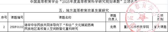 艺术与传媒学院龙燕老师主持的《铸牢中华民族共同体导向下“和合”文化赋能西南民族地区高校育人空间数智化重构研究》成功立项重大课题。